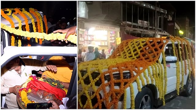 पंढरपूर (सोलापूर) : विठुरायाची शोभायात्रा चक्क स्कॉर्पिओ गाडीतून काढण्यात आली. फुलांनी सजवलेल्या गाडीतून देवाच्या पादुकांची प्रथमच अशी मिरवणूक काढण्यात आली. देवाच्या पादुकांची मिरवणूक ही रथातून किंवा पालखीमधून निघत असते. परंतु यावर्षी कोरोना प्रादुर्भावाच्या पार्श्वभूमीवर यंदा देवाच्या पादुकांना गाडीतून मंदिरात नेण्यात आल्या. मार्गशीर्ष महिन्यात साक्षात विठुरायाचे वास्तव्य विष्णुपद मंदिरात असते. तशी आख्यायिका आहे. या दरम्यान भाविक दर्शनासाठी विष्णुपद मंदिरात जातात. मंदिरातील देवाच्या पादुका विष्णुपद मंदिरात दर्शनासाठी ठेवल्या जातात.