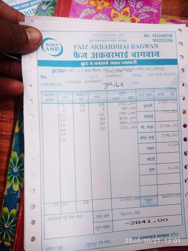 सलगर बुद्रूक (ता. मंगळवेढा) येथील शेतकरी अशोक जाधव यांच्याकडे दोन हजार गणेश वाणाच्या डाळिंबाची झाडे आहेत. त्यांनी दोन दिवसांपूर्वी सोलापूर येथील कृषी उत्पन्न बाजार समितीमध्ये 99 क्रेट डाळिंब विक्रीसाठी पाठवले होते. त्या डाळिंबाची विक्री झाल्यानंतर दुकानदाराच्या औषधाची बाकी भागवायची त्यांनी ठरवले होते. पण, डाळिंबाची पट्टी जेव्हा त्या शेतकऱ्याने पाहिली तेव्हा त्यांच्या पायाखालची जमीनच सरकली. ते डाळिंब विकून पैसे यायचे तर सोडाच उलटपक्षी वाहतूक भाडे त्यांच्यावर बसले. वाहन चालकास पदरचे पैसे द्यावे लागले. दरम्यान, औषधाच्या बाकीचा भार त्यांच्या डोक्यावर तसाच राहिला.