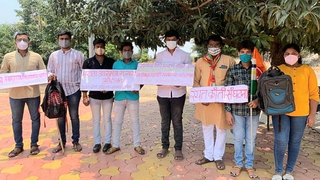 टेंभुर्णी (सोलापूर) : मराठा आरक्षणाच्या (Maratha Community Reservation) समर्थनार्थ व महाविकास आघाडी सरकारच्या (Mahavikas Aghadi government) निषेधार्थ "माझे अंगण हेच रणांगण' या अनोख्या पद्धतीने "मराठ्यांच्या पोरांचं आरक्षण बांधलं काठीला, महाविकास आघाडी सरकार निघाले काशीला' हे घोषवाक्य घेऊन उजनी (टें) येथे सोलापूर जिल्हा रयत क्रांती संघटनेचे (Rayat Kranti S00anghatna) जिल्हाप्रमुख तथा राज्य कृषिमूल्य आयोगाचे माजी सदस्स प्रा. सुहास पाटील यांच्या नेतृत्वाखाली आंदोलन (Agitation) केले. (Rayat Kranti Sanghatana's agitation for Maratha reservation at Tembhurni)