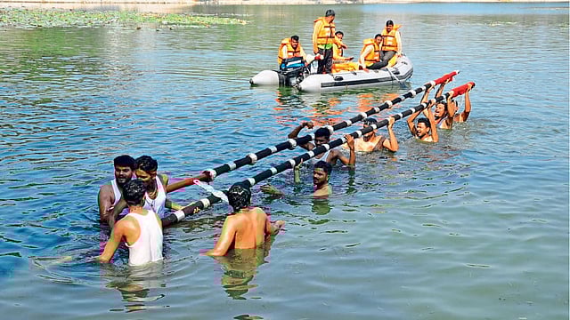 सोलापूर : संबळच्या निनादात, श्री सिद्धेश्वरांच्या जयघोषात सातही नंदीध्वज मिरवणुकीने श्री सिद्धेश्वर तलावाजवळ आले. हळद आणि तेलाच्या मिश्रणाने श्री सिद्धेश्वरांची मूर्ती, योगदंड व सातही नंदीध्वजांना हळद लावून करमुटगी स्नान घालून हळद काढण्यात आली तर अमृतलिंगाची पूजा करून गंगापूजन करण्याचा धार्मिक विधी रविवारी (ता. १५) पार पडला.