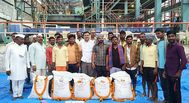 पंढरपूर (सोलापूर) : धाराशिव साखर कारखाना युनिट तीन, शिवणी (जा) मध्ये यंदाच्या हंगामातील पहिल्या पाच साखर पोत्याचे पूजन हमाल कामगारांच्या हस्ते करण्यात आले.