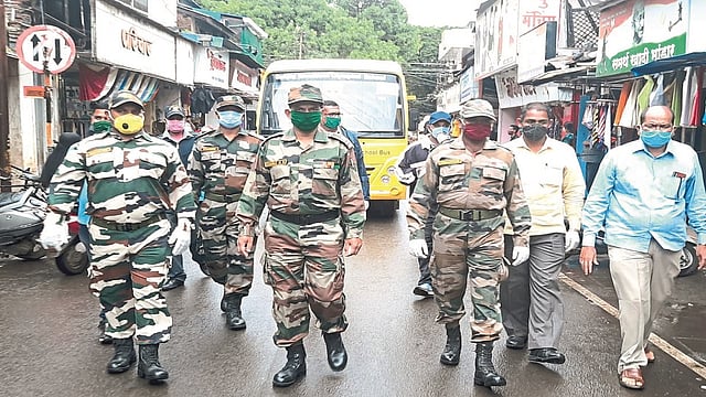 महापालिका क्षेत्रात कोरोना रुग्णांच्या संख्येत रोज वाढ होत आहे. अशावेळी नागरिकांनी स्वयंशिस्तीचे पालन करण्याची गरज असतानाही कोरोना प्रतिबंधाच्या नियमांचे उल्लंघन होत असल्याचे दिसून आले आहे. कोरोना प्रतिबंधक नियमांची काटेकोर अंमलबजावणी व्हावी या उद्देशाने कामगार अधिकारी अनिल चव्हाण यांनी 10 माजी सैनिकांची नेमणूक केली आहे. हे माजी सैनिक आजपासून महापालिका सेवेत दाखल झालेत. लष्करी गणेवशातील या टास्क फोर्सने आज शहरातील बाजारपेठेत संचलन करुन नागरिकांना सोशल डिटन्स पाळणे, मास्क वापरणे तसेच रस्त्यावर न थुंकणे याबाबत जागृती केली.