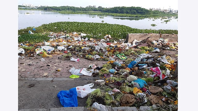 सोलापूर : नऊ दिवस देवीच्या नावाने पूजा केल्या जाणाऱ्या घटांचे प्लास्टिक कॅरिबॅगत घालून संभाजी तलावातील पाण्यात विसर्जन केले जात आहे. हे चित्र दरवर्षीचेच असून, यामुळे संभाजी तलावाच्या प्रदूषणात वाढ होत आहे.