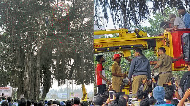 काही वेळाने या व्यक्तीला खाली आणण्यासाठी प्रयत्न सुरू झाले. अग्निशामक दलाने बुमच्या साहाय्याने त्याच्यापर्यंत जाण्याचा केलेला प्रयत्न अपुरा ठरला. शेवटी काही धाडसी ग्रामीण युवकांनी झाडावर चढत त्याला कसेबसे खाली आणले आणि बुधवारी (ता. ४) सकाळपासून सुमारे तीन-चार तास चाललेल्या ‘शोले स्टाईल’च्या या थरारनाट्याची अखेर झाली.