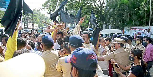 भाजपचे शहरातील पदाधिकारी, कार्यकर्ते, बुथप्रमुखांना सोमय्या यांनी रविवारी पक्षाच्या मोरवाडीतील कार्यलयाच्या आवारात आयोजित बैठकीत मार्गदर्शन केले. त्यानंतर माध्यमांशी संवाद साधला. त्या वेळी शिवसेनेचे नेते अर्जून खोतकर यांच्यासह ठाकरे सरकारवर भ्रष्टाचाराचे आरोप केले. त्यानंतर पुढील कार्यक्रमाला जात असताना शिवसेनेच्या कार्यकर्त्यांनी काळे झेंडे दाखवत त्यांच्या वाहनांचा ताफा रोखण्याचा प्रयत्न केला. पोलिसांनी आंदोलकांना रोखून धरत वाहनांना वाट करून दिली. या वेळी झालेल्या झटापटीत शिवसेना शहरप्रमुख तथा नगरसेवक सचिन भोसले यांचा शर्ट फाटला. आंदोलन संपल्यावर त्यांनी शर्ट बदलला. दरम्यान, भाजप कार्यालय इमारतीच्या प्रवेशद्वारावर थांबून सोमय्या पान ८ वर