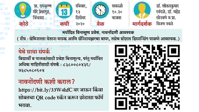 चिंचवड येथील प्रा. रामकृष्ण मोरे प्रेक्षागृहात रविवारी (ता. १३) होणाऱ्या या चर्चासत्रात विविध अभ्यासक्रमांच्या ऑनलाइन प्रवेश प्रक्रियेमध्ये प्रवेशासाठी अर्ज करताना विद्यार्थी व पालकांना अनेक प्रश्न असतात. जसे की, ही प्रवेश प्रक्रिया ऑनलाइन पद्धतीने कशी होणार आहे? प्रवेशाच्या किती फेऱ्या होणार व कशा होणार? ही प्रवेश प्रक्रिया केव्हापर्यंत चालेल? महाविद्यालये कधी सुरू होणार सविस्तर मार्गदर्शन करण्यात येणार आहे. कोरोनाच्या पार्श्वभूमीवर सोशल डिस्टन्सिंग पाळून या चर्चासत्राचे आयोजन केले आहे. त्यामुळे जागा मर्यादित असल्याने प्रथम नोंदणी करणाऱ्यास प्राधान्य दिले जाणार आहे.