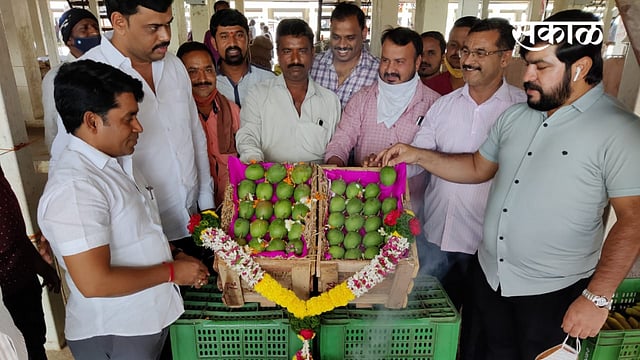 या पेट्यांचे पूजन लोखंडे यांच्या हस्ते करण्यात आले. या वेळी आडतदार गणेश सस्ते, मारुती बिराजदार, नितीन गावडे, बिभीषण चेडे, दादा काळजे, नितीन समदाडे तसेच घाऊक व्यापारी उपस्थित होते. संपूर्णपणे नैसर्गिक पध्दतीने पिकविण्यात येणाऱ्या या पाच ते सहा डझनच्या पेटीचा भाव सध्या आवक कमी असल्याने नऊ ते दहा हजार रुपये आहे. सुरुवातीची आवक असल्याने भाव जास्त आहेत. मात्र यापुढे गुढीपाडव्यापर्यंत हे भाव कमी होतील, असे आंबा आडतदार संतोष सोनवणे यांनी सांगितले.