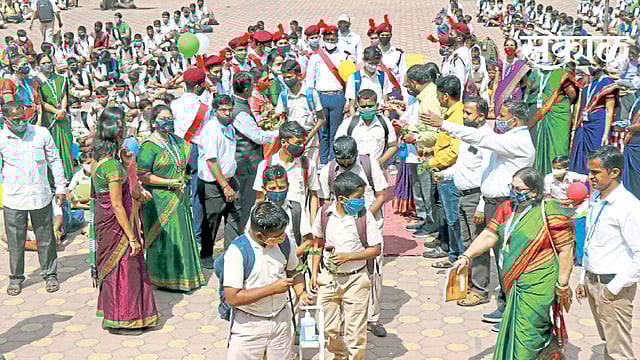 पिंपरी - सकाळच्या कोवळ्या उन्हात तब्बल दहा महिन्यांनी शाळांचे प्रांगण गुरुवारी (ता. 4) गजबजले. घंटा घणघणली. विद्यार्थ्यांनी सादर केलेल्या प्रार्थनांचे शब्द परिसरात घुमले. "भारत माझा देश आहे...' या प्रतिज्ञेचे शब्द कानी पडले. राष्ट्रगीतानंतर "भारत माता कीऽऽ जयऽऽऽ'चा नारा दिला. आणि मान्यवरांच्या हस्ते गुलाबपुष्प घेऊन चिमुकली पावले आपापल्या वर्गाकडे वळली, कारण पाचवी ते आठवीपर्यंतची शाळा सुरू झाली.