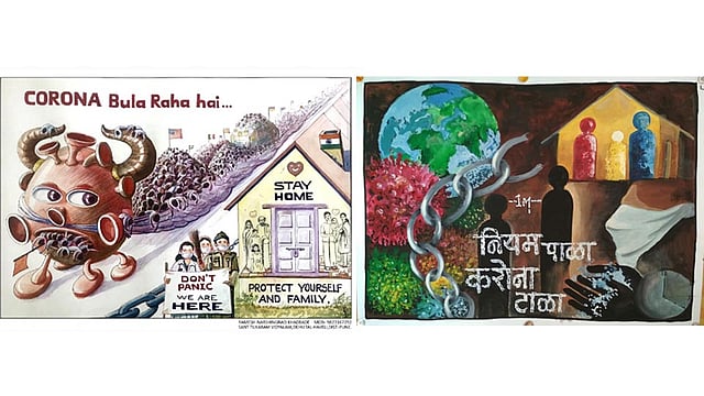मोशी : 'कधी सुटेल हा विळखा कोरोनारुपी राक्षसाचा, पीके शेतातच गेली वाया', 'सुटला बांध शेतकरीराजाचा घरातच राहून घेऊ काळजी, तेव्हा सुटेल हा विळखा कोरोना राक्षसाचा', अशी कोरोनामुक्तीच्या दृष्टीने विविध स्लोगन असलेली पोस्टर चित्रांच्या माध्यमातून पुणे जिल्ह्यातील 70 कलाशिक्षकांनी आपल्या जादूई कुंचल्यातून रेखाटली आहेत. त्यातून समाजप्रबोधन करीत कोरोना जनजागृती अभियानात आपला खारीचा वाटा उचलला आहे.