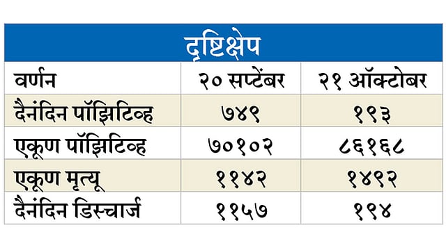 सप्टेंबरच्या तिसऱ्या आठवड्यापासून कोरोना रुग्णांची संख्या कमी होऊ लागली आहे. त्यापूर्वी जुलै, ऑगस्ट व सप्टेंबरच्या पहिल्या पंधरवड्यापर्यंत दररोज दीड हजारांपर्यंत रुग्ण आढळत होते. मृतांची संख्याही दिवसाला ५० पर्यंत पोचली होती. या पार्श्वभूमीवर महापालिकेने दोन जम्बो कोविड रुग्णालये सुरू केले आहेत. १९ ठिकाणी कोविड केअर सेंटर सुरू केले होते. आता रुग्णसंख्या कमी झाल्याने केवळ सात कोविड सेंटर सुरू आहेत. बुधवारी (ता. २१) दुपारी चार वाजेपर्यंत केवळ दोन हजार दोनशे सक्रिय रुग्ण होते. महापालिकेच्या वायसीएम, जिजामाता, भोसरी, तालेरा, मगर स्टेडियम व ऑटोक्लस्टर जम्बो रुग्णालयांसह खासगी रुग्णालयांतील रुग्ण संख्याही कमी झाली आहे.