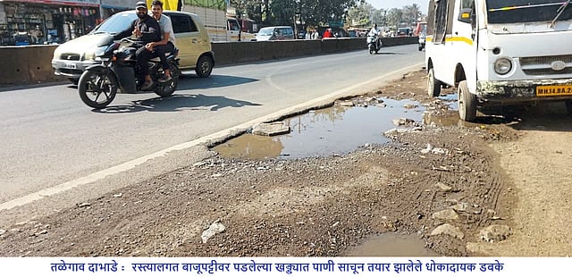 तळेगाव दाभाडे : रस्त्यालगत बाजूपट्टीवर पडलेल्या खड्ड्यात पाणी साचून झालेले धोकादायक डबके.