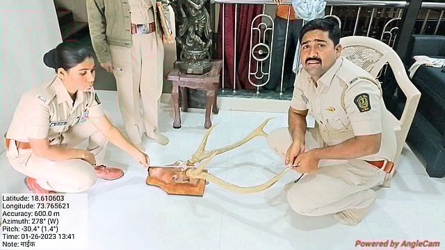 मुळशीच्या वनविभागाला मिळालेल्या गुप्त माहितीनुसार थेरगावातील शिव कॉलनी, लेन नं. २बी मधील सुरेश अप्पा नाईक यांच्या धनश्री बंगलोवर मुळशीचे वनपरिक्षेत्र अधिकारी तसेच घोटावडे येथील वनपाल यांच्यासह वनविभागाच्या पथकाने धाड मारून झडती घेतली असता सांभर प्रजातीच्या वन्यप्राण्याची शिंगे तोंडाच्या सांगाड्यासह आढळून आली. प्रथमदर्शनी सदर शिंगे लाकडापासून तसेच पीओपी असून घरामध्ये शोपीस म्हणून बनवलेली लावलेली असा आभास निर्माण करण्यात आला. परंतु, सांगाडा ताब्यात घेऊन तपासणी केली असता सदरची शिंगे ही सांभर प्राण्याचीच असल्याचे आढळून आले. आरोपींना चौकशीसाठी ताब्यात घेतले असता सदर शिंगे २० वर्षांपासून घरामध्ये असल्याचे मान्य केल्याने आरोपींवर वन्यजीव (संरक्षण) अधिनियम, १९७२ चे कलम ३९, ५०, ५१ नुसार गुन्हा नोंद करण्यात आला आहे. ही कारवाई मुळशी वनपरिक्षेत्र अधिकारी संतोष चव्हाण, वनपाल घोटावडे प्रज्ञा बनसोडे, वनरक्षक पांडुरंग कोपनर, संतोष मुंडे व कर्मचाऱ्यांनी केली.