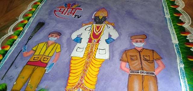 कोरोना व्हायरसचा अधिक प्रादुर्भाव होऊ नये यासाठी सफाई कर्मचारीही जीव धोक्यात घालून परिसर स्वच्छतेचे काम करत आहेत. त्याचप्रमाणे शिक्षकांद्वारे परिसरातील नागरिकांचे करण्यात आलेल्या सर्व्हेमुळे प्रशासनाला कोरोना व्हायरसच्या प्रसाराबाबत महत्त्वाची माहिती संकलित करता आली. त्यामुळे कोरोना व्हायरसच्या संक्रमण काळात डॅाक्टर, नर्स, पोलिस, शिक्षक आदी महत्त्वाची भूमिका बजावत आहेत. या कोरोना योद्ध्यांना भोसरीतील रांगोळी कलाकार भूषण खंडारे याने डॅाक्टरांच्या वेशभूषेत विठ्ठलाची रांगोळी साकारत कोरोनाग्रस्तांसाठी डॅाक्टर म्हणजे प्रत्यक्ष विठ्ठलाचेच रुप असल्याचे दर्शविले आहे.