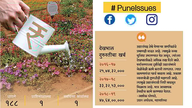 शहर आणि उपनगरांमध्ये सध्या विविध प्रकारची १९० उद्याने आहेत. त्यात कात्रज येथील स्व. राजीव गांधी प्राणिसंग्रहालय आणि पर्यावरण कार्यालयाचाही समावेश आहे. उद्यानात फिरायला जाणाऱ्यांच्या संख्येत वाढ होत आहे. ज्या भागांमध्ये उद्यान नाही, तेथे उभारण्याचे नियोजन आहे. मात्र जुन्या उद्यानांच्या दुरवस्थेचा प्रश्न नेहमीच चर्चेत राहिला आहे. त्याकडे लक्ष वेधताच उद्यान विभागही तत्परतेने दखल घेताना दिसतो. नियमित आणि योग्य देखभाल होत नसल्याने या कामांचा खर्च वाढत असल्याचे कर्मचाऱ्यांनी सांगितले.