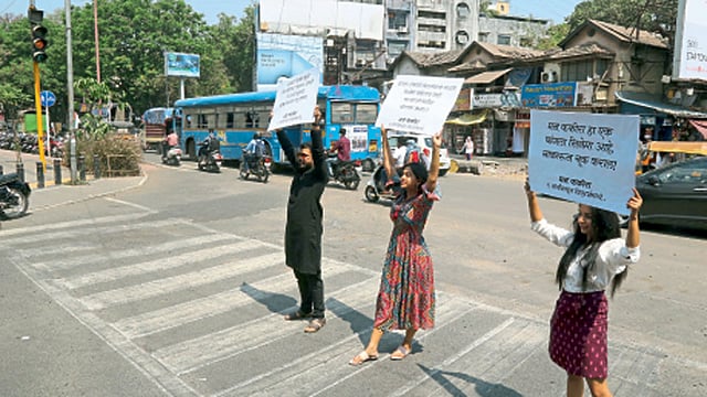 अभिनेत्री मृण्मयी देशपांडे, सायली संजीव, अभिनेते सुव्रत जोशी यांनी गोखले चौकात सोमवारी दुपारी बाराच्या सुमारास फलक हातात धरले. त्यांना पाहून या रस्त्यावरील तरुणाईही काहीवेळ थबकली होती. मराठी अस्मिता जागी व्हावी, मराठी भाषेच्या संवर्धनासाठी मराठी प्रेक्षकांनी या भाषेतील कलाकृतींना पाठबळ द्यावे, अशी अपेक्षा सर्वत्र व्यक्त होत असताना या होतकरू कलाकारांनी त्यांचा एक चित्रपट या आठवड्यात प्रदर्शित होत आहे. त्याचे प्रमोशनही यातून केले. नागरिकांनीही त्यांच्याकडे कुतूहलाने पाहत चित्रपटगृहात येऊनच चित्रपट पाहण्याचे त्यांना आश्वासन दिले. या बाबत मृण्मयी म्हणाली, ‘‘मराठी चित्रपटसृष्टीत आज नवनवीन प्रयोग होत आहेत; पण माध्यमांच्या भडीमारामुळे चित्रपटगृहात जाऊन चित्रपट पाहण्याची सवय कमी होते की काय, अशी भीती वाटत आहे, म्हणून आम्ही हा हटके प्रयोग अवलंबला.’