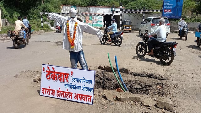 येथे अचानक समोर खड्डा दिसल्यानंतर अर्जंट ब्रेक लावल्याने दुचाकी वाहने स्लीप होऊन नागरिकांना गंभीर जखमा झाल्या. काही जागरूक नागरिकांनी खड्ड्याभोवती दगड लावले, परंतु रात्री अंधारात या दगडांना धडकून चारचाकी वाहने खड्ड्यात रूतली. अखेर आज (ता. २८) झुंज मित्र मंडळाच्या कार्यकर्त्यांनी एक बुजगावणे तयार करून ते खड्ड्यात उभे केले. त्यावर ‘ठेकेदार उठलाय निष्पाप नागरिकांच्या जिवावर, दररोज होतायेत अपघात, असे लिहिलेले आहे.