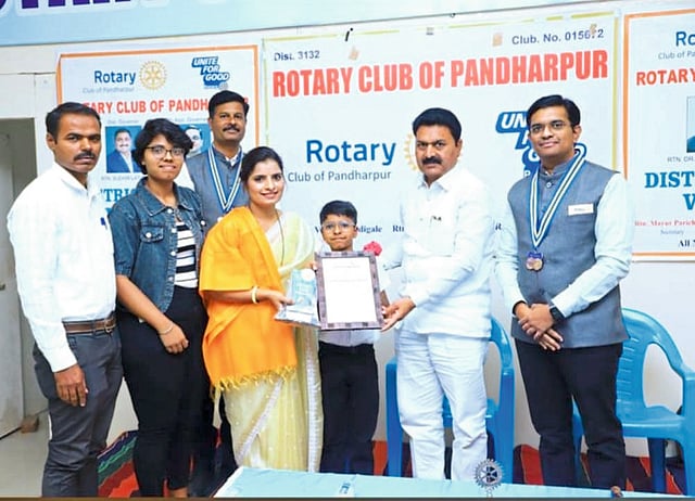 पंढरपूर : येथे रोटरीचा व्यावसायिकता पुरस्कार अनुराधा गाडेकर यांना प्रदान करताना माजी आमदार दत्तात्रय सावंत, रोटरीचे अध्यक्ष वैभव सादिगले, मयूर परिचारक आदी.