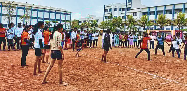 दहिवडी : दहिवडी कॉलेज दहिवडीमध्ये आयोजित वार्षिक क्रीडा महोत्सवातील कबड्डी स्पर्धेतील एक क्षण. (रूपेश कदम : सकाळ छायाचित्रसेवा)