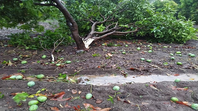 आपटाळे : जुन्नर तालुक्याच्या पश्चिम आदिवासी भागाला काल झालेल्या चक्रीवादळाचा मोठा फटका बसला आहे. आंब्याचे आगर समजल्या जाणाऱ्या मीना नदीच्या खोऱ्यातील आंबा उत्पादकांना या वादळाने अक्षरशः उद्धवस्त केले आहे. वादळाचा तडाखा इतका जोरात होता की, बहुतांशी ठिकाणी आंब्याची झाडे उन्मळून पडली आहेत. काले येथे वादळी वारा व पावसामुळे आंब्याचा सडा शेतामध्ये पडल्याचे चित्र आहे. चार ते आठ दिवसांत या भागातील आंबा काढणी सुरू होणार होती. या वर्षी आंब्याचे उत्पादन देखील कमी होते. त्यातच वादळी तडाख्याने आंब्याचे नुकसान केल्याने हातातोंडाशी आलेला घास हिरावून गेल्याने आंबा उत्पादक आर्थिक अडचणीत सापडला आहे. शासनाने पंचनामे करून तातडीने आर्थिक मदत करून आंबा उत्पादकांना दिलासा द्यावा, अशी मागणी आंबा उत्पादक करत आहेत. निरगुडे येथे मोठे झाड कोसळल्याने स्मशानभूमीचे नुकसान झाले आहे. बेलसर ते येणेरे रस्त्यावर विजेचे खांब रस्त्याच्या दिशेने पूर्णतः वाकल्याने अपघात होण्याची भीती व्यक्त केली जात आहे. बहुतांशी ठिकाणी विजेचे खांब कोसळल्याने आदिवासी भागात वीजपुरवठा खंडित होता. बेलसर येथे दोन महिने कोरडेठाक असलेला मीना नदीचा बंधाऱ्यात पाणी साचले. काले येथे कुलदीप नायकोडी यांचा फरशीचा बाग जमीनदोस्त झाला आहे. कुसुर येथे राजेंद्र भगत यांचा अडीच एकर क्षेत्रावरील केळीचा बाग जमीनदोस्त होऊन जवळपास 5 ते 6 लाख रुपयांचे नुकसान झाले आहे. संजय परदेशी यांच्या शेततळ्याचा कागद पूर्णतः फाटून गेल्याने नुकसान झाले आहे. पारुंडे येथे राजेंद्र पवार यांच्या आंब्याचे मोठ्या प्रमाणावर नुकसान झाले आहे.