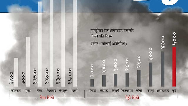 दीड कोटी लोकसंख्येच्या कोलकातामध्ये नायट्रोजन डायऑक्साइड उत्सर्जनाचे प्रमाण दर दिवशी चार हजार किलोपेक्षा कमी आहे. तेच प्रमाण पुण्यात सुमारे पाच हजार किलो आहे. नायट्रोजन डायऑक्साइडच्या उत्सर्जनात पुण्याच्या पुढे मुंबई, चेन्नई, हैदराबाद, बंगळूर आणि दिल्ली या मेगासिटी आहेत.