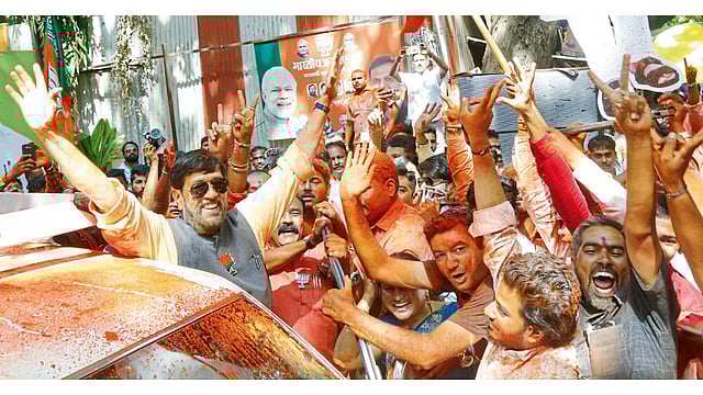 भाजपला राष्ट्रीय स्तरावर बहुमत मिळण्याची चिन्हे दिसू लागल्यामुळे युतीच्या कार्यकर्त्यांमध्ये उत्साह दुणावला अन् त्यांचा जल्लोष वाढला.