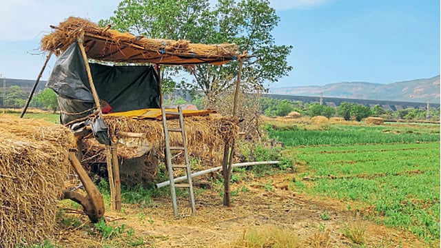 टाकवे बुद्रुक - सध्या नाणे मावळातील शिवारांत लागवड केलेल्या विविध पिकांचे वन्यप्राणी आणि पक्ष्यांपासून संरक्षण व्हावे म्हणून शेतकऱ्यांनी आपापल्या शेतावर मचाण बनवल्या आहेत.