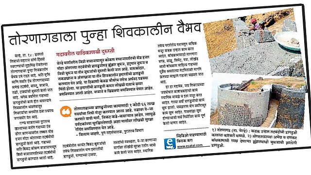 अतिदुर्गम आणि उंच तोरणागडाची अभेद्य तटबंदी, वास्तू, दरवाजे, तळी, टाक्यांची दुरुस्ती केली जात आहे. अनेक वर्षांनंतर गडाच्या डागडुजीची कामे होत असल्याने शिवकालीन अवशेषातून शिवरायांचा अनमोल ठेवा प्रथमच जगासमोर येत आहे. संबंधित वृत्त ‘सकाळ’सह ‘ई-सकाळ’वर ‘तोरणागडाला पुन्हा शिवकालीन वैभव’ अशा शीर्षकाखाली व्हिडिओसह प्रसिद्ध झाले. बारा हजारांपेक्षा जास्त वाचकांनी व्हिडिओ पाहिला. त्यानंतर प्रतिक्रिया नोंदविताना