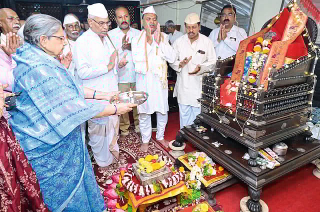फलटण : मुधोजी मनमोहन राजवाड्यातील देवघरात सद्गुरू गोदडनाथ महाराज यांच्या पादुकाची आरती करताना सुभद्राराजे नाईक- निंबाळकर, समवेत नाईक निंबाळकर देवस्थान व इतर चॅरिटीज ट्रस्टचे पदाधिकारी.