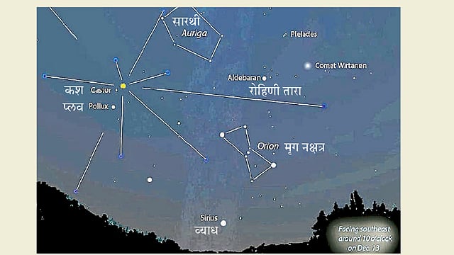 १२ आणि १३ तारखेला रात्री नंतरची वेळ योग्य राहील. साधारणतः दीड वाजता मिथुन रास या दोन दिवशी डोक्यावर असेल. आकाशात मिथुन रास शोधण्यासाठी सोबतच्या चित्राचा आधार घ्या.