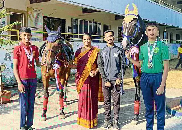 पिरंगुट, ता. ३० : सारंगखेडा (नंदुरबार) येथील चेतक राज्यस्तरीय अश्वारूढ स्पर्धेत कासार अंबोली (ता. मुळशी) येथील हेरिटेज इंटरनॅशनल स्कूलमधील विद्यार्थ्यांनी प्रशिक्षक मानस येनपुरे यांच्या मार्गदर्शनाखाली उल्लेखनीय कामगिरी करीत राज्यस्तरावर विविध पदके पटकाविली. या स्पर्धेत केसरी व शुभ्रक या घोड्यांसह शो जंपिंग (नॉर्मल व टॉप स्कोअर), हॅट रेस रिले, पोल बेंडिंग, बॉल इन बकेट तसेच जंपिंग चॅलेंज आदी विविध प्रकारांमध्ये स्पर्धा घेण्यात आल्या. ओपन कॅटेगरीमध्ये संघाने शो जंपिंगमध्ये (नॉर्मल) सुवर्ण, शो जंपिंगमध्ये (टॉप स्कोअर) सुवर्ण व कांस्य, हॅट रेस रिलेमध्ये रौप्य तसेच जंपिंग चॅलेंजमध्ये सुवर्ण पदक पटकावले. यावेळी एक मीटर २० सेंटीमीटर उंच उडी मारून नवीन विक्रम प्रस्थापित करण्यात आला.