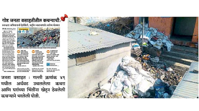 पुणे - स्वच्छ भारत अभियानांतर्गत शहरात भिंती रंगविण्याचे काम सुरू आहे. मात्र, जनता वसाहतीतील गल्ली क्रमांक ४९ मध्ये कचऱ्याचे ढीग साचले आहेत. गेल्या १५ दिवसांपासून त्याकडे कोणी फिरकलेही नाही. याची दखल ‘सकाळ’ने घेत २ डिसेंबरच्या अंकात संबंधित समस्येबाबत प्रकाशझोत टाकला. त्यानंतर महापालिका प्रशासन खडबडून जागे झाले अन कचरा उचलण्याचे काम हाती घेतले; परंतु, महिन्याचा कालावधी संपत आला तरी ते काम पूर्ण होऊ शकले नाही.