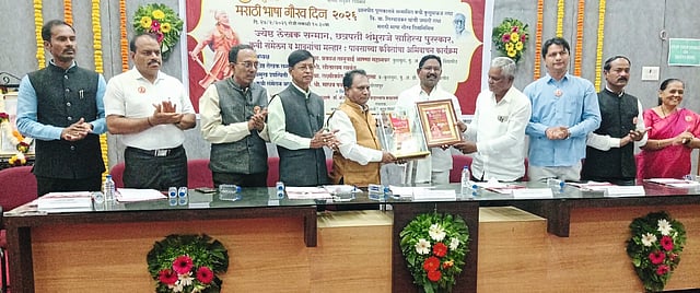 सोलापूर : छत्रपती शंभुराजे साहित्य पुरस्कार प्रा. डॉ. किसन माने यांना प्रदान करताना कुलगुरू डॉ. लक्ष्मीकांत दामा आणि ज्येष्ठ साहित्यिक सीताराम सावंत व इतर मान्यवर.