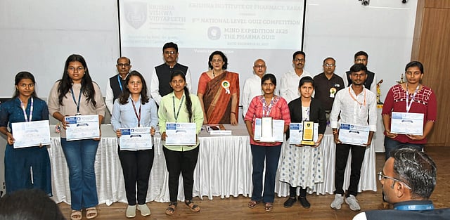 मलकापूर, ता. १ : कृष्णा विश्व विद्यापीठ संलग्न कृष्णा इन्स्टिट्यूट ऑफ फार्मसीच्या वतीने राष्ट्रीय स्तरावरील ९ वी ‘माईंड एक्सपिडिशन २०२५’ प्रश्नमंजूषा स्पर्धा उत्साहात झाली. सहकारमहर्षी (कै.) जयवंतराव भोसले यांच्या जयंतीनिमित्त या स्पर्धेचे आयोजन केले होते. अंतिम फेरीत झालेल्या चुरशीच्या लढतीत श्रेया परीट हिने प्रथम, तर मनीषा बाड हिने द्वितीय क्रमांक मिळविला.
