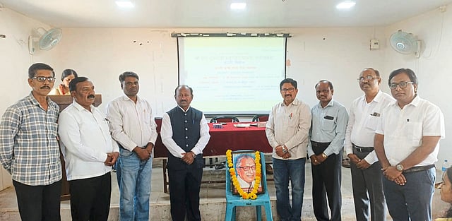 पूजनप्रसंगी प्र. प्राचार्य औदुंबर जाधव उपप्राचार्य प्रा. राजेंद्र गायकवाड व इतर.