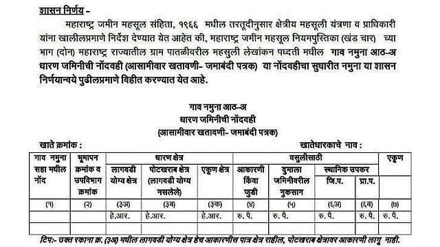 प्रत्येक तलाठी सजात गाव नमुना आठ अ उतारे सुधारित नमुन्यात ठेवण्याची दक्षता घेण्यात यावी, तसेच सातबारा संगणक प्रक्रियेमध्ये नमुन्यानुसार आवश्यक त्या सुधारणा करण्यात याव्यात, अशा सूचनाही महसूल विभागास देण्यात आल्या आहेत.