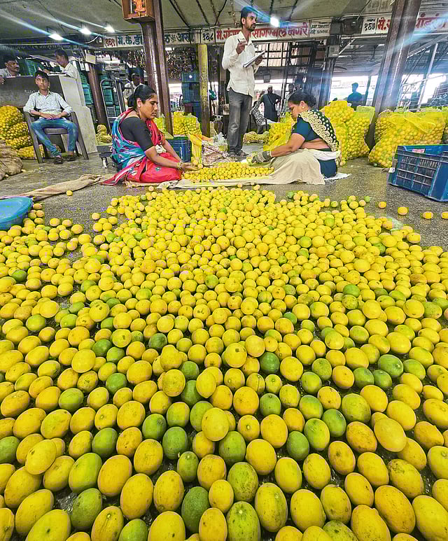 मार्केट यार्ड, ता. २२ : उन्हाचा कडाका दिवसागणिक वाढत आहे. त्यामुळे बाजारात लिंबू चांगलेच भाव खात आहे. बाजारात लिंबाची आवक कमी झाली आहे. किरकोळ बाजारात एक लिंबू दर्जानुसार ५ ते ७ रुपयांना मिळत आहे. मागणीच्या तुलनेत आवक कमी होत असल्याने दर तेजीत आहेत. घाऊक बाजारात दर्जानुसार एक गोणी ५०० ते १२०० रुपयांना विकली जात आहे.