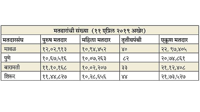 पुणे - पुण्यासह बारामती, शिरूर आणि मावळ या चार लोकसभा मतदारसंघांत अंतिम मतदार यादीनुसार एकूण मतदारांची संख्या ८६ लाख ५८ हजार २०१ इतकी झाली आहे. त्यात पुरुष मतदारांची संख्या ४५ लाख २५ हजार ४२४, तर महिला मतदारांची संख्या ४१ लाख ३२ हजार ५७८ इतकी आहे.