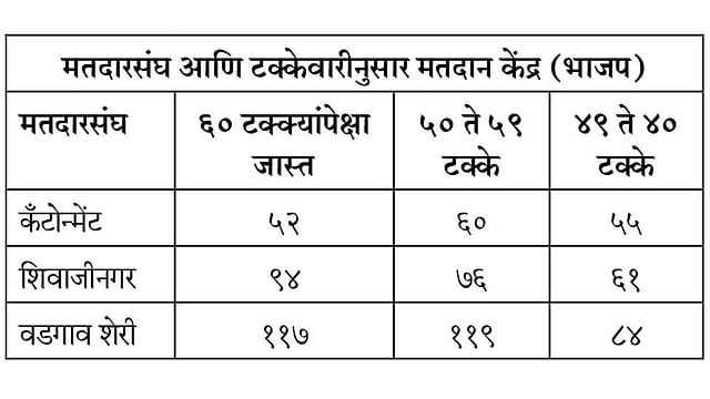 २०१४ च्या लोकसभा निवडणुकीमध्ये झालेल्या मतदानानुसार कसबा, पर्वती, वडगाव शेरी, शिवाजीनगर, पुणे कॅंटोन्मेंट आणि कोथरूड या मतदारसंघात मतदान केंद्रनिहाय वर्गवारी करण्यात आली आहे. भाजपला ६० टक्क्यांपेक्षा जास्त मतदान झालेले केंद्र, ५० ते ५९ टक्के, ४० ते ५० टक्के, २० ते ३० टक्के आणि १९ टक्क्यांपेक्षा कमी मतदान झालेले केंद्र याचे विश्लेषण केले आहे. भाजपला पुणे कॅंटोन्मेंट, शिवाजीनगरचा काही भाग व वडगाव शेरी येथील भागात ४० ते ५९ टक्के मतदान झालेल्या केंद्रांची संख्या ४५५ एवढी मोठी आहे; तर याच भागात काँग्रेस, राष्ट्रवादी आणि मनसेला जास्त मते मिळाली आहेत. हे तिन्ही पक्ष आता लोकसभा निवडणुकीसाठी एकत्र आहेत. त्याचा फटका या भागाला बसू नये यासाठीची व्यूहरचना आखण्यात आली आहे. याभागात विविध संघटना, संस्थांच्या पदाधिकाऱ्यांशी बैठका, गाठीभेटी घेतल्या जात आहेत.