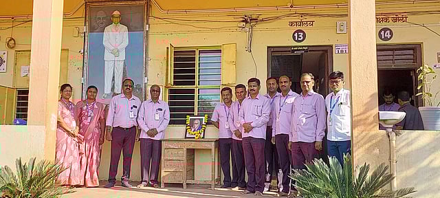 कोळा (ता. सांगोला) : येथील कोळा विद्यामंदिरात कविश्रेष्ठ वि. वा. शिरवाडकर तथा कुसुमाग्रज यांच्या प्रतिमेस पुष्पहार अर्पणप्रसंगी शिक्षक.