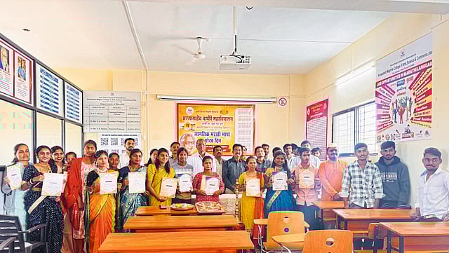 डॉ. रोहिणी मदने यांनी प्रास्ताविक केले. ग्रंथालय विभाग प्रमुख डॉ. निलेश हांडे, उपप्राचार्य डॉ. कल्याण सोनावणे, डॉ. वसंत गावडे, डॉ. रमेश शिरसाट, डॉ. आशुतोष ठाकरे, डॉ. राजेंद्र आंबवणे, डॉ. रमेश गोपाळे यांनी मराठी भाषेविषयी आपली अभ्यासपूर्ण मांडणी केली. सर्व विद्यार्थ्यांच्या वतीने श्रद्धा अहिनवे हिने मराठीची महती या विषयावर मनोगत दिले. कार्यक्रमासाठी डॉ. निलेश काळे, प्रा. अर्जुन मोध्ये, हेमंत पाटील, रमेश गोसावी व निखिल काकडे उपस्थित होते. विद्यार्थी प्रतिनिधी अर्णव बेनके याने मराठी भाषेचा गुणगौरव करणारी कविता सादर करीत सूत्रसंचालन केले. तर, कोमल नलावडे हिने आभार मानले.
