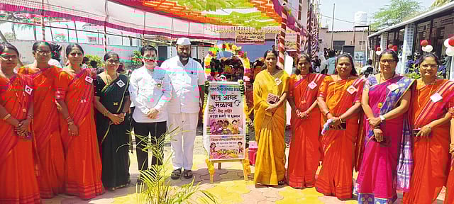 मोर्वे ः बाल आनंद मेळाव्यासाठी आकर्षक ड्रेसकोड करून सहभागी झालेल्या शिक्षिका. यावेळी उपस्थित पदाधिकारी .
