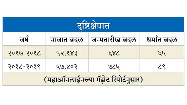बदलत्या काळात नावात बदल करण्याची मानसिकता वाढली आहे. त्यामुळे सरकारने यासाठी शासकीय फोटोझिंको मुद्रणालय व ग्रंथागार कार्यालये सुरू केली आहेत. २०१५ पासून नाव बदलण्याचे कामकाज www.dgps.maharashtra.gov.in या वेबसाइटवर ऑनलाइन केले जाते. जिल्ह्यात २०१७-१८ मध्ये ५२ हजार १४३ जणांनी, तर २०१८-१९ मध्ये ५७ हजार ४०२ जणांनी नाव आणि आडनावात बदल केले आहेत. पूर्वी नोकरदार महिला लग्नानंतर सासरचे नाव लावण्यासाठी नावात बदल करत होत्या. आता ज्योतिषी, व अंकशास्त्रानुसार नाव बदलण्याच्या सल्ल्यामुळे नाव, आडनाव बदलणाऱ्यांची संख्या वाढत आहे.