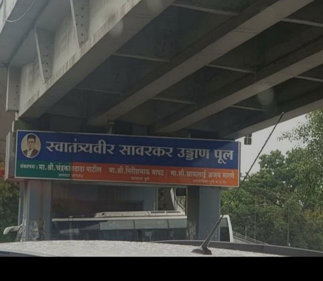पुणे महानगरपालिकेच्यावतीने कोथरुडमधील पहिला उड्डाणपुल दशभुजा गणपती येथे बांधण्यात आला. त्यावेळेस पालिकेत काँग्रेसची सत्ता होती. त्यावेळी या पुलाचे नामकरण स्वातंत्र्यवीर वि. दा. सावरकर असे करण्यात आले. आता या पुलाच्याखाली नव्याने जो नामफलक बसवण्यात आला आहे त्यावर संकल्पना म्हणून आमदार चंद्रकांत पाटलांचे नाव टाकण्यात आले आहे. त्याचबरोबर खासदार गिरीश बापट, नगरसेविका छाया मारणे यांचे नाव या फलकावर आहे. पाटीवरच्या मजकुरात अचानक झालेला हा बदल अनेकांना खटकला. त्यामुळे समाज माध्यमावर या पाटीची चर्चा चांगलीच रंगली आहे.