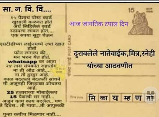 टपालदिनानिमित्त पोस्टकार्डावरील एक मेसेज आज व्हायरल होतोय. या पोस्टकार्डाच्या पत्त्याच्या जागी दुरावलेले नातेवाईक, मित्र, स्नेही यांच्या आठवणीत....असा उल्लेख आहे, तर पिनकोडच्या जागी मी काय म्हणतो...असे लिहीले आहे.