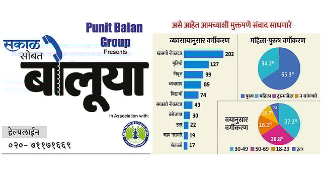 सकाळ माध्यम समूहातील ‘सकाळ सोशल फाउंडेशन’च्या वतीने we are in this together या मोहिमेअंतर्गत व पुनीत बालन ग्रुप यांच्या सौजन्याने आणि कर्वे समाज सेवा संस्थेच्या सेंटर फॉर मेंटल हेल्थ अँड डीसअँबीलीटीजच्या सहकार्याने मानसिक ताण - तणाव व्यवस्थापन व एकूणच मानसिक स्वास्थ्य व समस्यांच्या मार्गदर्शनासाठी ‘सकाळ सोबत बोलूया’ ही चोवीस तास मोफत हेल्पलाइन तीन ऑगस्ट रोजी सुरू करण्यात आली. त्याला आज दोन महिने पूर्ण झाले.