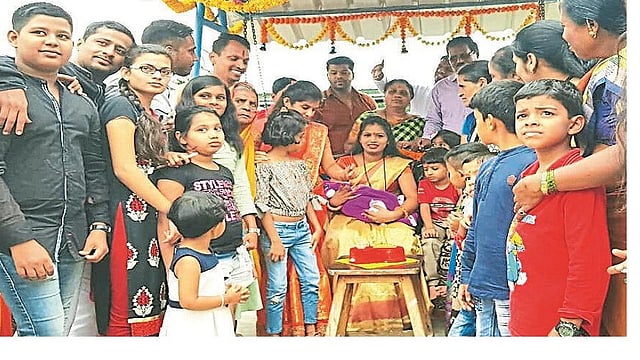 या मिरवणुकीत शांभवीची आजी अलका व आजोबा नामदेव थिगळे, मामा राहुल गावडे, थिगळे कुटुंबाचे सगेसोयरे, भाऊबंद व परिसरातील महिला नटूनथटून सहभागी झाल्या होत्या. सर्वच महिला फुगड्या खेळल्या. शांभवीच्या स्वागतासाठी घराबाहेर रंगीबेरंगी फुग्यांची मोठी कमान उभारली होती. पाळण्यासह घर व परिसर आकर्षक फुलांनी सजवला होता. उंबरठा ओलांडताना तिच्या गृहप्रवेशासाठी फुलांच्या पायघड्या घातल्या होत्या. त्यावरून गृहप्रवेश होताना तिचे पाऊलठसे घेण्यात आले.