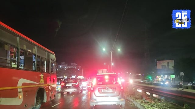 Heavy traffic jam on Pune-Bengaluru Highway near Katraj Tunnel to Warje stretch, with vehicles stranded for over an hour due to congestion.