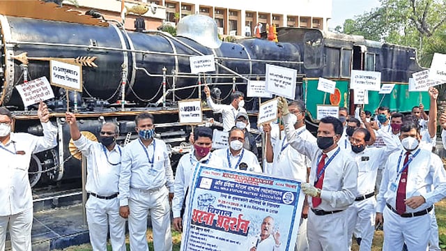 पुणे - कोरोनाच्या काळात आघाडीवर राहून रेल्वेत काम करणाऱ्या कर्मचारी व अधिकाऱ्यांना ५० लाख रुपयांचे विमा कवच द्यावे, रात्रपाळीची सीलिंग मर्यादा ४३ हजार ६०० रुपये करण्याचा आदेश रद्द करावा आदी मागण्यांसाठी शहरातील रेल्वे स्टेशन मास्तरांनी बुधवारी विभागीय रेल्वे प्रबंधक कार्यालय येथे धरणे आंदोलन केले.