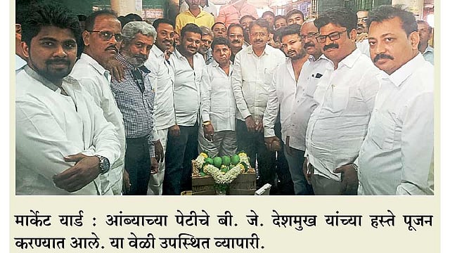 कृषी उत्पन्न बाजार समितीचे प्रशासक बी. जे. देशमुख यांच्या हस्ते या पेटीचे पूजन केले. या वेळी फळ विभागाचे प्रमुख बाबासाहेब बिबवे, तरकारी विभागाचे प्रमुख दत्तात्रय कळमकर, अडते असोसिएशनेचे उपाध्यक्ष युवराज काची, करण जाधव, प्रताप निकम, रामदास गायकवाड, भरत परदेशी, संजय वखारे, तात्या कोंडे, राजू ओसवाल, राजू पतंगे, आण्णा हराळे, कामगार युनियनचे अध्यक्ष विलास थोपटे, राजू सूर्यवंशी, अनिरुद्ध भोसले, अनिकेत भोसले, ऋषिकेश भोसले, अजिंक्य कांचन, बलभीम माजलगावे उपस्थित होते. रावसाहेब कुंजीर या अडत्याने लिलावात ही पेटी खरेदी केली.