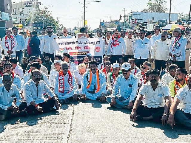 रहिमतपूर ः सातारा-रहिमतपूर राज्यमार्गावर रास्ता रोकोत सहभागी राष्ट्रवादी व शिवसेनेचे पदाधिकारी. (इम्रान शेख ः सकाळ छायाचित्रसेवा)